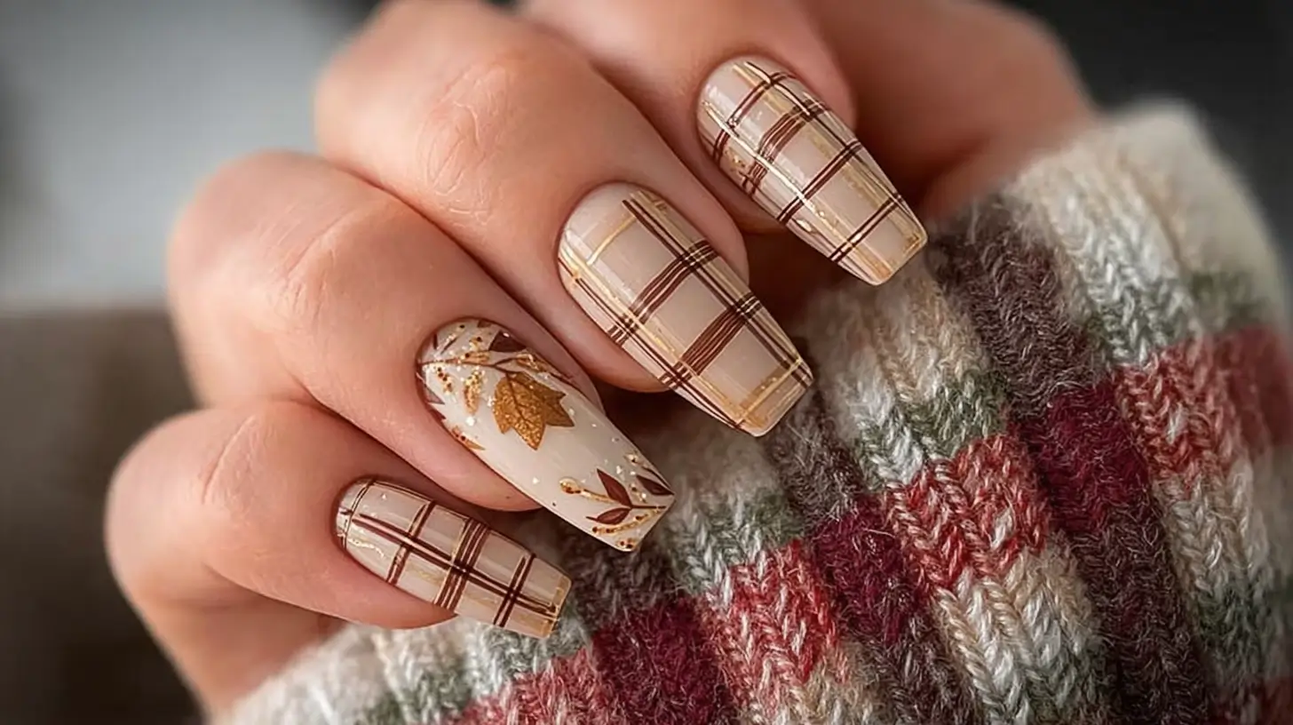 Plaid prints, gold accents, leaf art, and warm earthy tones make perfect November nails for Thanksgiving.